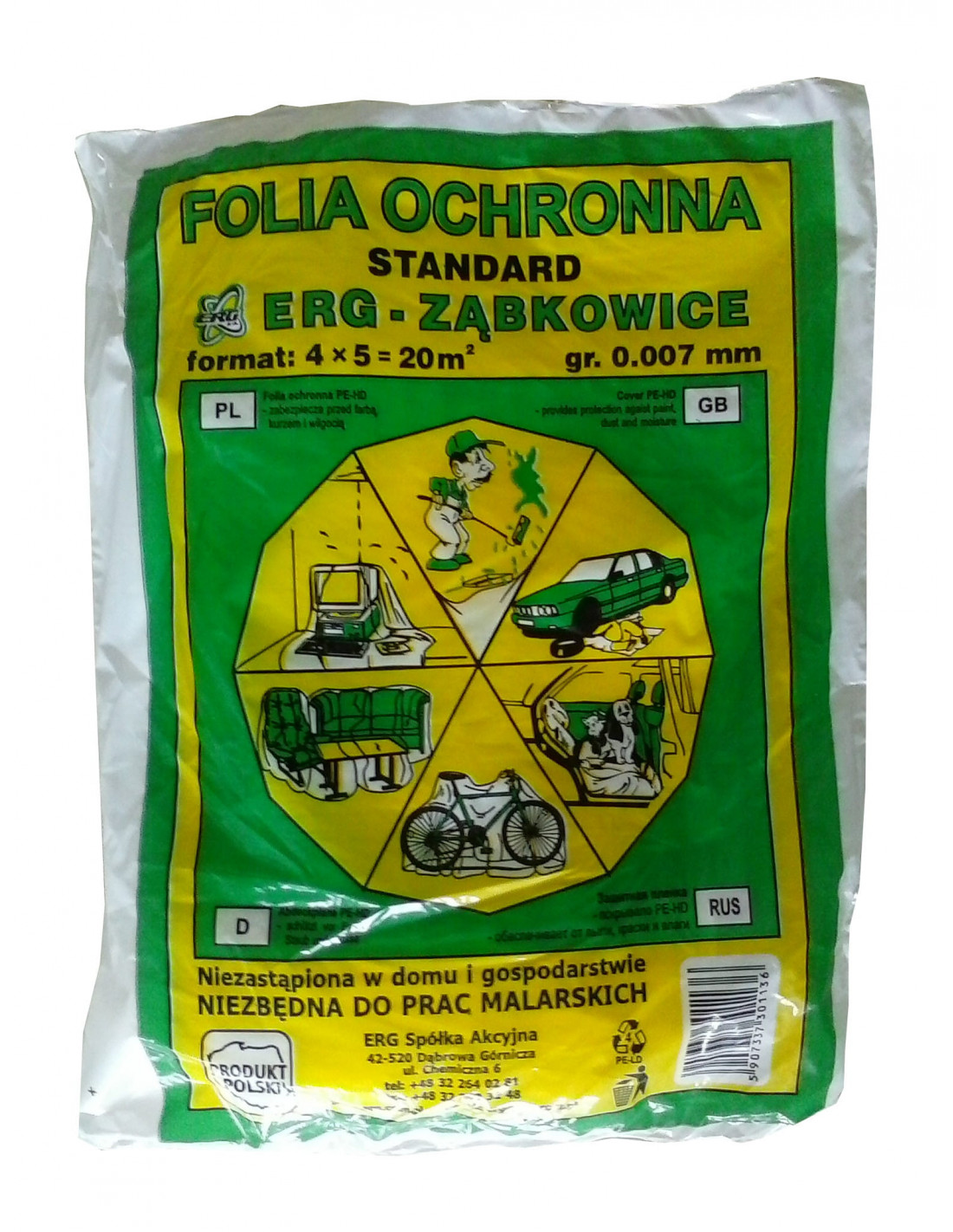 Folia Ochronna Gruba 4mx5m ZłotyStok sztuka Folia ochronna wykonana z Polietylenu. Chroni meble i podłogę przed farbą, kurzem i brudem. Grubsza folia to lepsze zabezpieczenie , a co za tym idzie gwarancja pełnej ochrony . Wybierz ten rodzaj folii jeś...