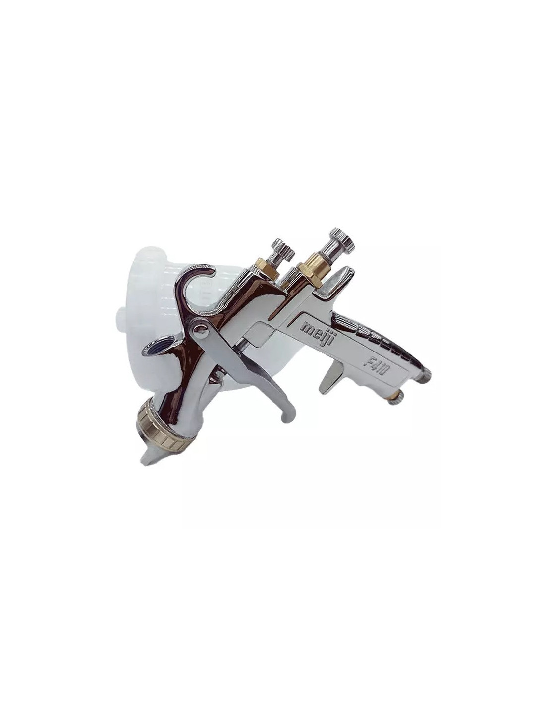 F410 to flagowy pistolet marki Meiji, charakteryzuje się wysoką wydajnością i dobrym wyważeniem. Pistolet dostępny jest w kilku konfiguracjach głowic rozpylający (średniociśnieniowe -EV, EVW, SP oraz niskociśnieniowe -HVLP). Dla każdej z głowic przewidziany został odpowiedni zakres dysz materiałowych (1,0 -2,5).